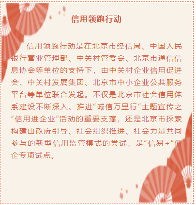 信用领跑行动是在北京市经信局、中国人民银行营业管理部、中关村管委会、北京市通信信息协会等单位的支持下,由中关村企业信用促进会、中关村发展集团、北京市中小企业公共服务平台等单位联合发起。不仅是北京市社会信用体系建设不断深入、推进“诚信万里行”主题宣传之“信用进企业”活动的重要支撑,还是北京市探索构建由政府引导、社会组织推进、社会力量共同参与的新型信用监管模式的尝试,是“信易+”便企专项试点。