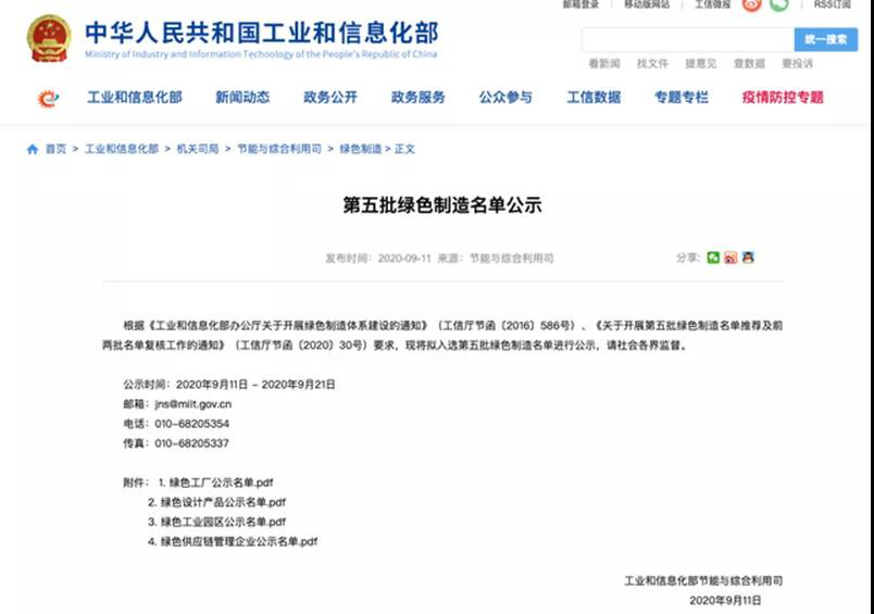 为贯彻实施制造强国战略,进一步打造绿色制造先进典型,加快建设绿色制造体系,引领工业绿色发展,日前,工业和信息化部办公厅完成了第五批绿色制造名单的公示。此次公示的第五批绿色制造名单共有724个绿色工厂,99户绿色供应链管理示范企业,53家绿色工业园区,以及一批绿色设计产品。(http://www.miit.gov.cn/n1146285/n1146352/n3054355/n3057542/n5920352/c8077064/content.html)。